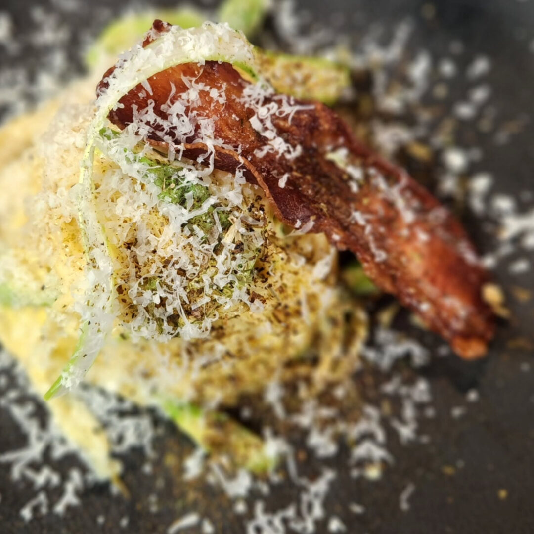 アスパラガスの出汁と卵のソースでパスタを仕上げ、最後は焦がしたアスパラガスの皮とブラックペッパーのミニョネット。